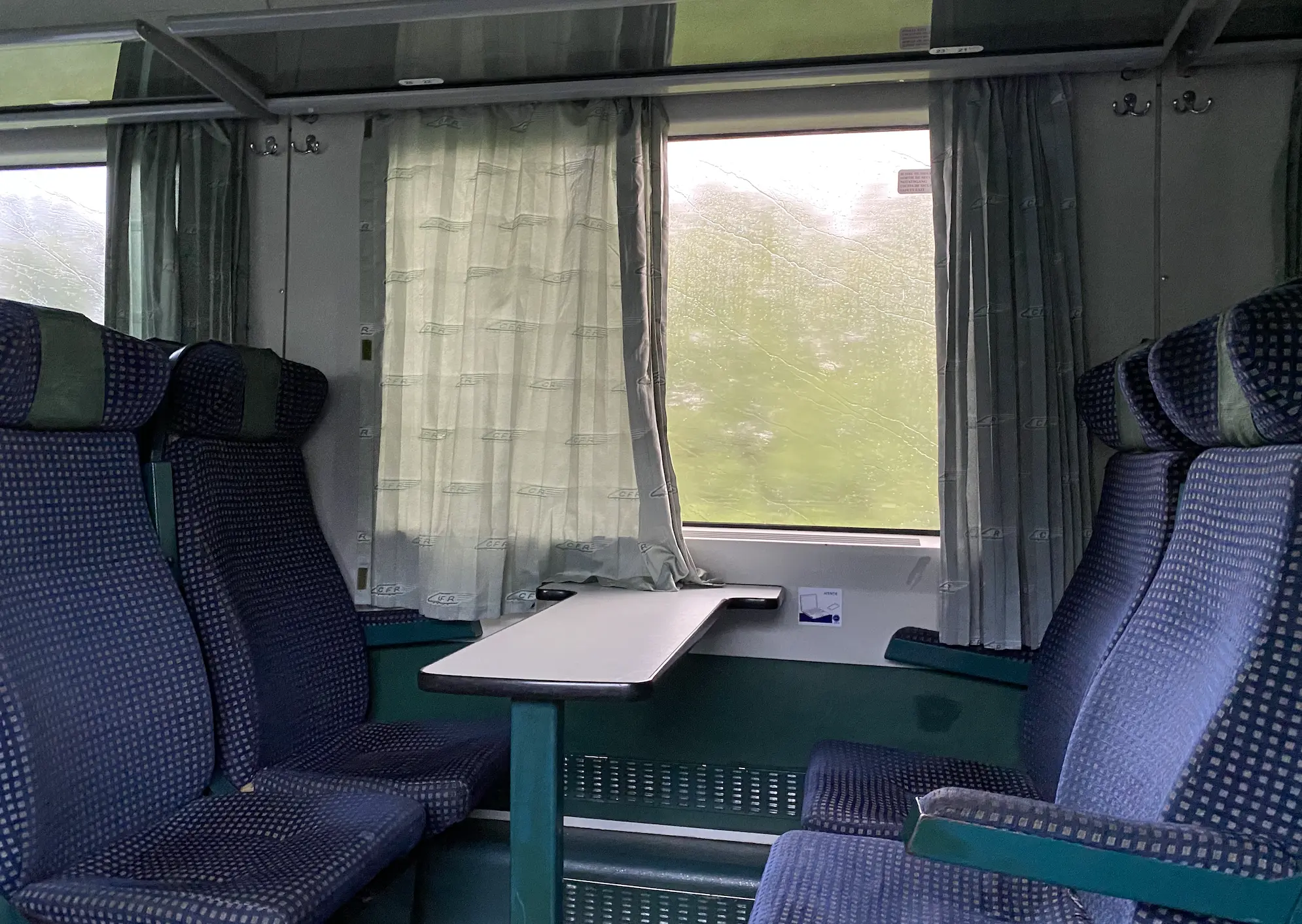Der Waggon erinnert an einen älteren IC. Die Sitzen sind bequem und es gibt Steckdosen an den meissten Plätzen. Die Toilette sollte man tunlichst meiden.