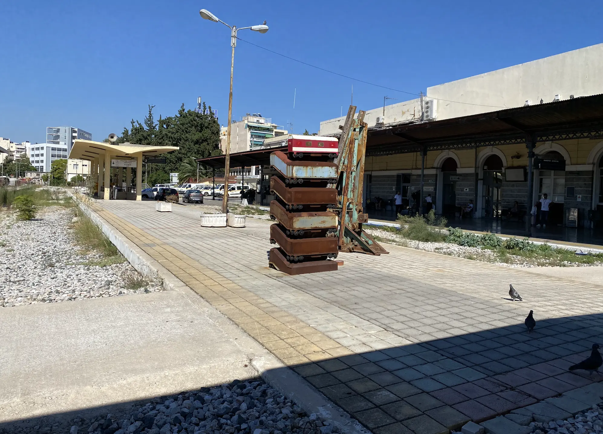 Nach 50 Minuten erreichen wir den Bahnhof “Athens”. Zwischen den neuen Gleisen und einer relativ neuen Bahnhofshalle findet man alte Bahnsteige mit verrosteter Kunst.